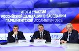Пресс-конференция по итогам участия российской делегации в заседании Парламентской ассамблеи ОБСЕ. Слева направо: председатель комитета Государственной думы (ГД) России по международным делам Леонид Слуцкий, заместитель председателя ГД России Петр Толстой и член комитета ГД России по безопасности и противодействию коррупции Николай Ковалев во время пресс-конференции в МИА "Россия сегодня" .