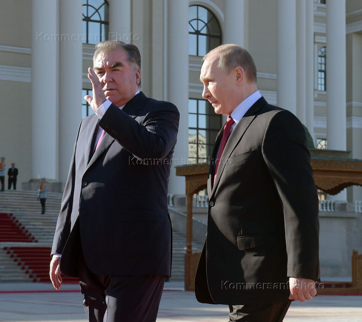 Официальный визит президента России Владимира Путина в Таджикистан. Президент Республики Таджикистан Эмомали Рахмон (слева) и президент России Владимир Путин (справа) во время церемонии официальной встречи у Дворца наций.