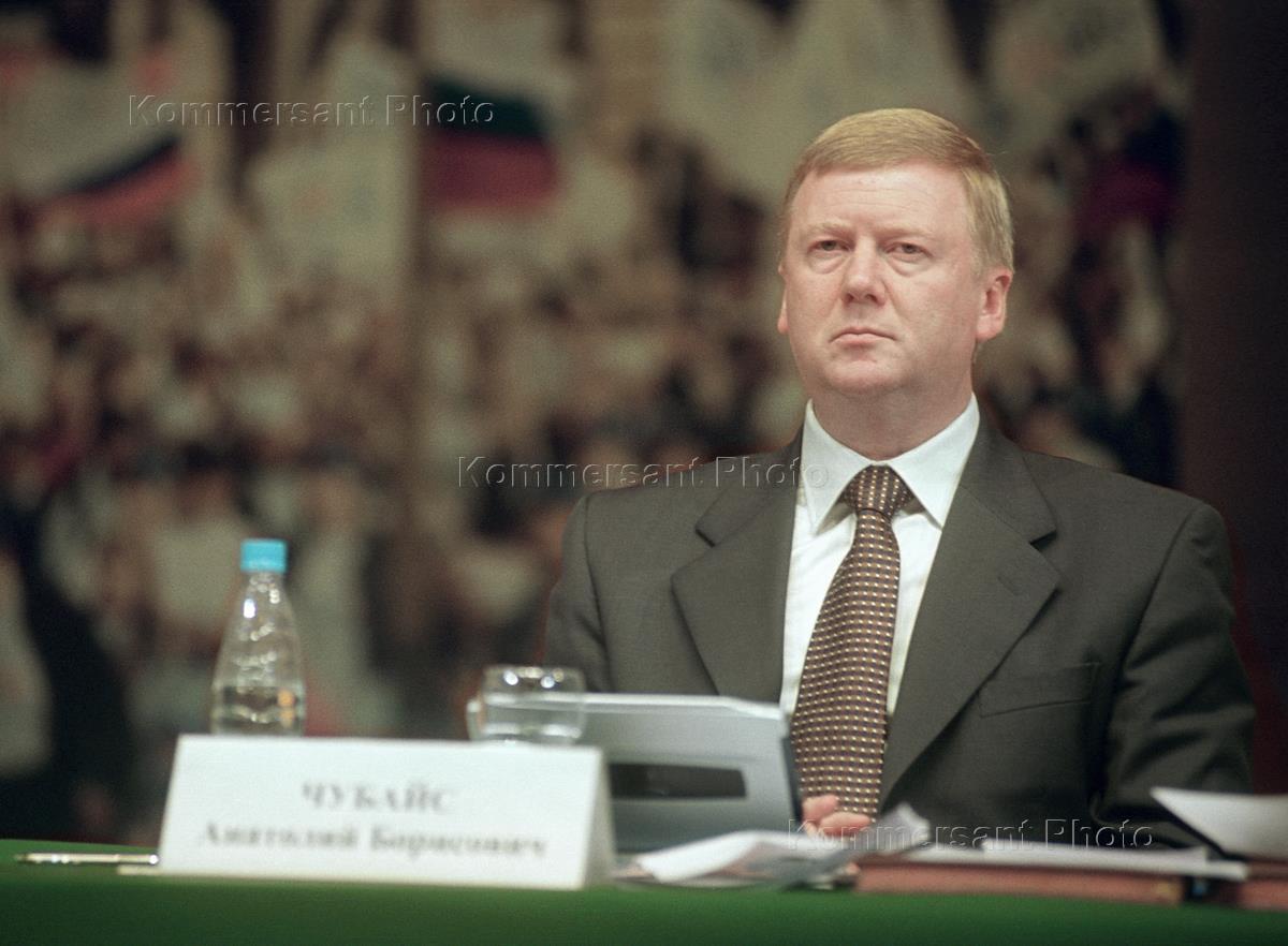 Director of the Transitional Economics Institute Yegor Gaydar (left) and chairman of Unified Energy Systems of Russia (UES Russia) national electric grid Anatoly Chubais (right) take part in the pre-electoral congress of the 'Union of the Right Forces' (SPS) party. The congress was held in the Moscow Music House.
