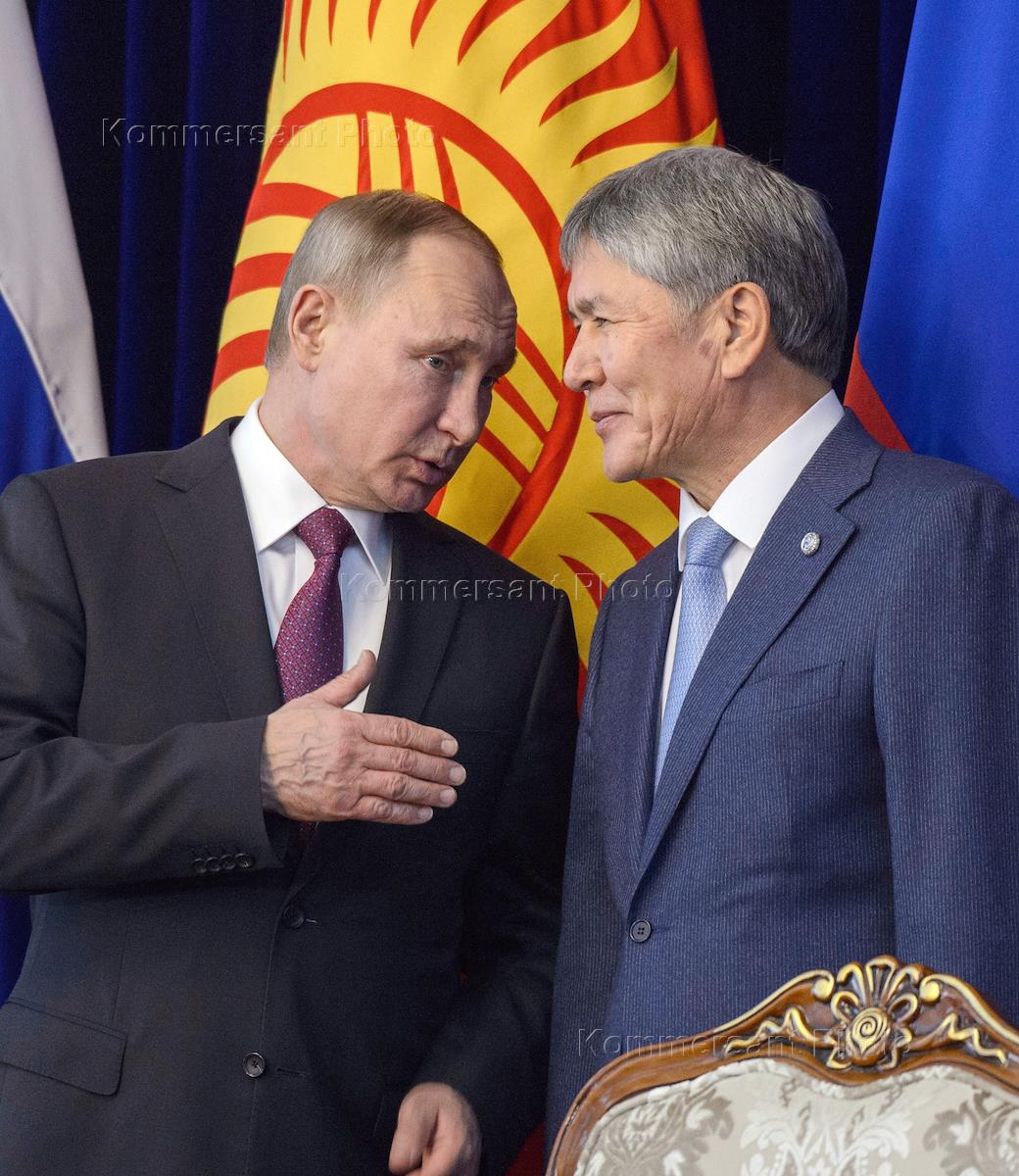 Рабочая поездка президента России Владимира Путина в Бишкек. Президент России Владимир Путин (слева) и президент Киргизии Алмазбек Атамбаев (справа) после окончания переговоров.