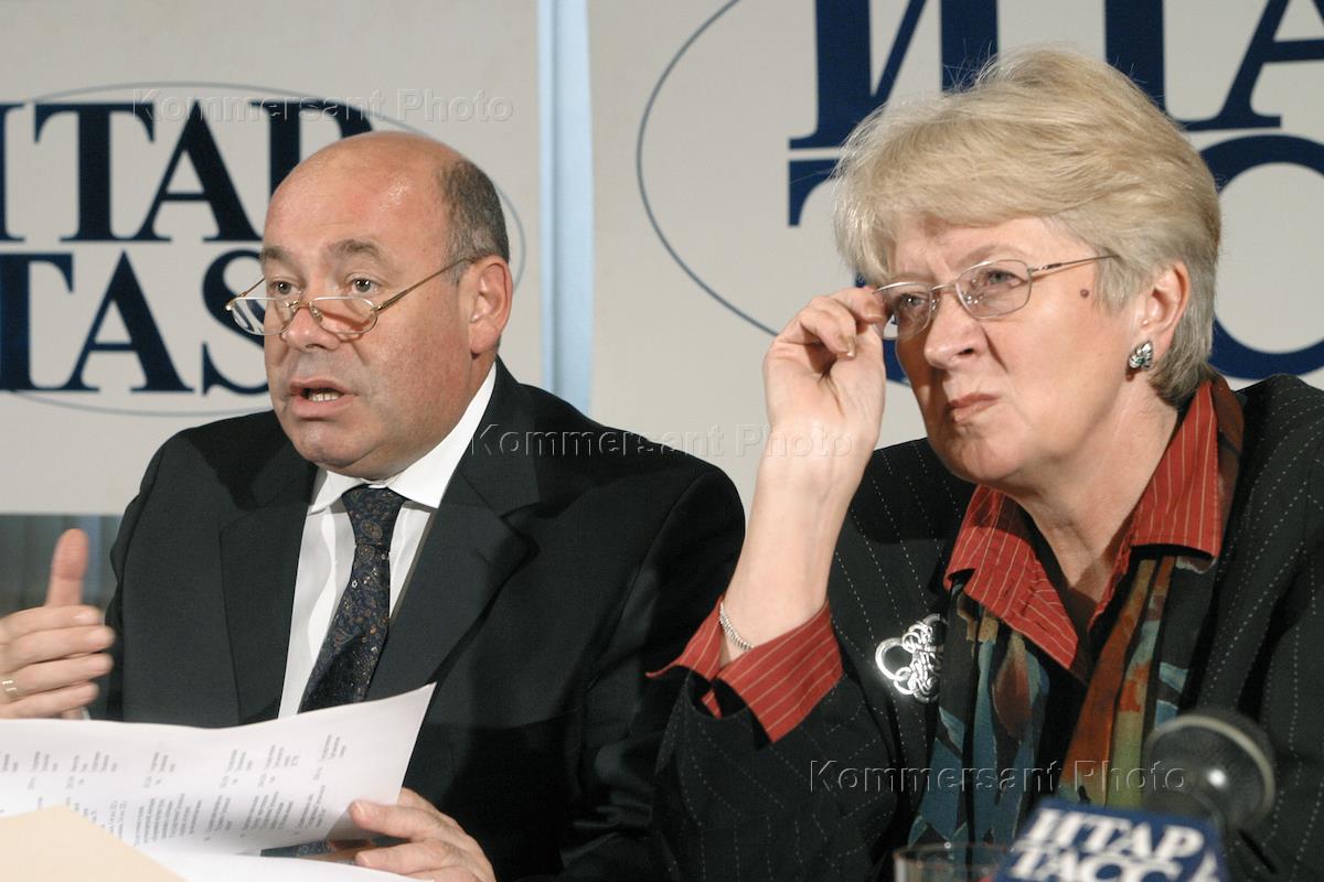 Russian Culture Minister Mikhail Shvydkoy (left) and Deputy Culture Minister Natalia Dementyeva (right) take part in the news conference summoned to discuss preparations for the Tretyakov Gallery 150th anniversary. The news conference was held in the ITAR-TASS news agency headquarters.