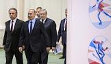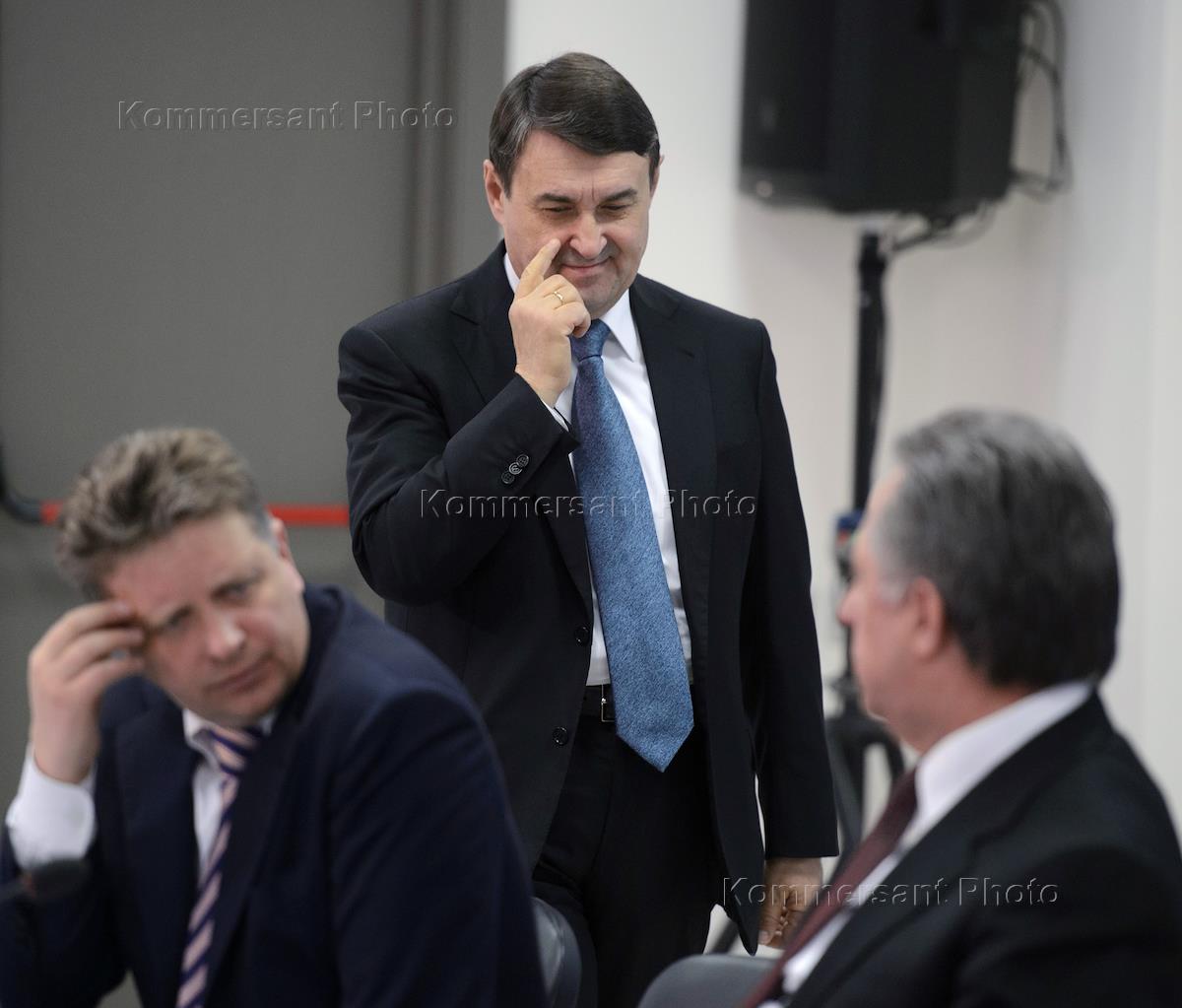 Рабочая поездка президента России Владимира Путина в Красноярск. Слева направо: министр транспорта России Максим Соколов, помощник президента России Игорь Левитин и заместитель председателя правительства России Виталий Мутко на совещании по подготовке к проведению в Красноярске XXIX Всемирной зимней универсиады 2019 года. Совещание прошло в Конгресс-холле Сибирского федерального университета (СФУ).