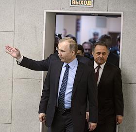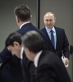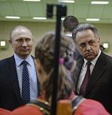 Рабочая поездка президента России Владимира Путина в Красноярск. Президент России Владимир Путин (в центре) и заместитель председателя правительства России Виталий Мутко (справа) перед началом совещания по подготовке к проведению в Красноярске XXIX Всемирной зимней универсиады 2019 года. Совещание прошло в Конгресс-холле Сибирского федерального университета (СФУ).
