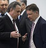 Рабочая поездка президента России Владимира Путина в Красноярск. Заместитель председателя правительства России Виталий Мутко (слева) и министр транспорта России Максим Соколов (справа) перед началом совещания по подготовке к проведению в Красноярске XXIX Всемирной зимней универсиады 2019 года. Совещание прошло в Конгресс-холле Сибирского федерального университета (СФУ).