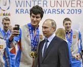 Рабочая поездка президента России Владимира Путина в Красноярск. Президент России Владимир Путин (в центре) и заместитель председателя правительства России Виталий Мутко (третий справа), во время встречи с победителями XXVIII Всемирной зимней Универсиады 2017 года, которая прошла в Алматы, в региональном центре спортивной подготовки "Академия биатлона".