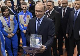 Рабочая поездка президента России Владимира Путина в Красноярск. Президент России Владимир Путин (в центре) во время встречи с победителями XXVIII Всемирной зимней Универсиады 2017 года, которая прошла в Алматы, в региональном центре спортивной подготовки "Академия биатлона".