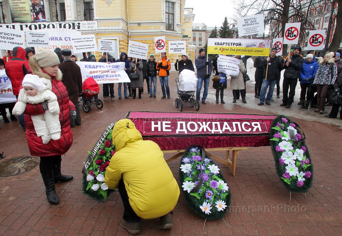 Пикет обманутых дольщиков компании "Квартстрой". Гроб с надписью "Не дождался" на фоне пикетчиков.