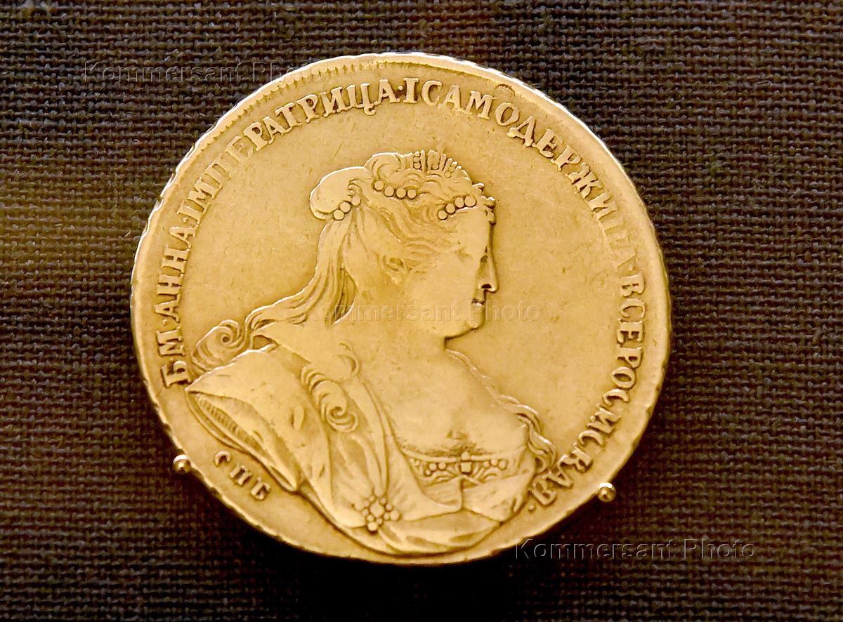 Церемония открытия выставки "Копейка рубль бережёт" в Строгановском дворце. Монета 1738 года достоинством в 1 рубль.