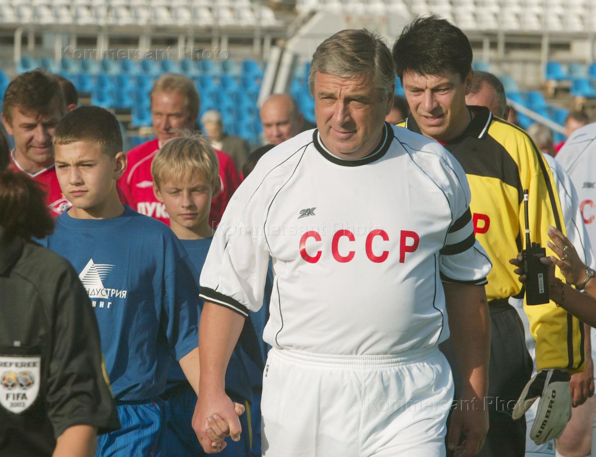 State secretary of the Union of Russia and Belorussia Pavel Borodin (centre) attends the symbolic football match between veteran teams of the USSR national team players and Spartak-Moscow club. The match was held to mark the anniversary of the legend of Russian football Yury Gavrilov.