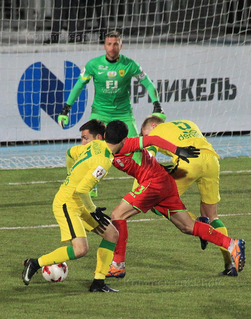 Кубок России по футболу. 1/4 финала. Матч между командами "Уфа" (Уфа) - "Анжи" (Махачкала). Вратарь команды "Анжи" Давид Юрченко (справа) во время матча.