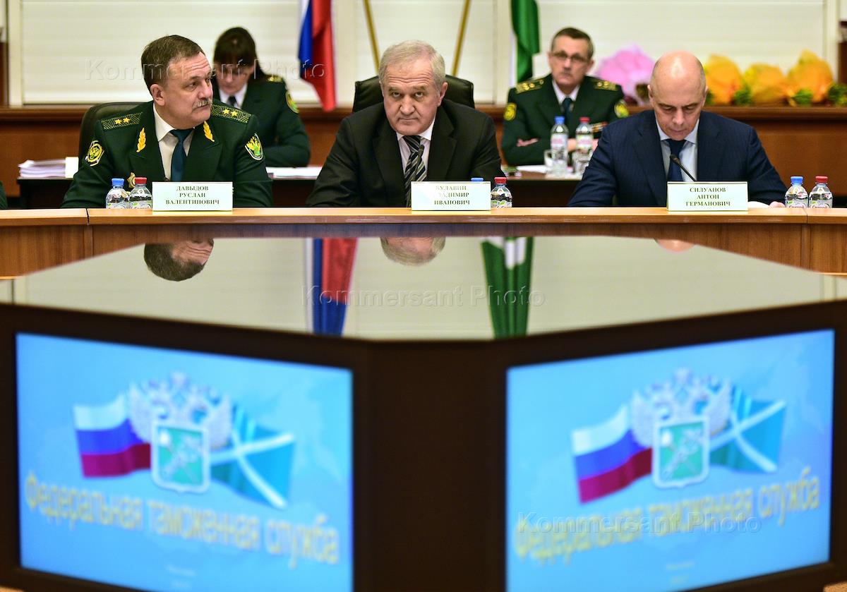 Расширенное заседание коллегии Федеральной таможенной службы России "Об итогах работы таможенных органов Российской Федерации в 2016 году и задачах на 2017 год". Слева направо: первый заместитель главы Федеральной таможенной службы России Руслан Давыдов, глава Федеральной таможенной службы России Владимир Булавин и министр финансов России Антон Силуанов во время заседания.