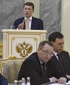 Совместное заседание коллегий Генеральной прокуратуры России и Министерства труда и социальной защиты России в Генеральной прокуратуре России. Слева направо: заместитель председателя правительства России Ольга Голодец, министр труда и социальной защиты России Максим Топилин и генеральный прокурор России Юрий Чайка во время заседания.