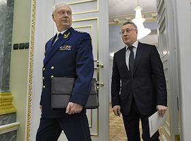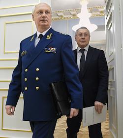 Совместное заседание коллегий Генеральной прокуратуры России и Министерства труда и социальной защиты России в Генеральной прокуратуре России. Заместитель генерального прокурора России, главный военный прокурор Сергей Фридинский (слева) и заместитель генерального прокурора России Леонид Коржинек (справа) перед началом заседания.