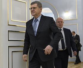 Совместное заседание коллегий Генеральной прокуратуры России и Министерства труда и социальной защиты России в Генеральной прокуратуре России. Заместитель генерального прокурора России Геннадий Лопатин (слева) перед началом заседания.