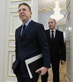 Совместное заседание коллегий Генеральной прокуратуры России и Министерства труда и социальной защиты России в Генеральной прокуратуре России. Министр труда и социальной защиты России Максим Топилин (слева) и министр здравоохранения России Вероника Скворцова (вторая слева) перед началом заседания.
