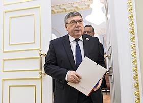 Совместное заседание коллегий Генеральной прокуратуры России и Министерства труда и социальной защиты России в Генеральной прокуратуре России. Представитель в Совете Федерации России от законодательной власти Курской области Валерий Рязанский перед началом заседания.