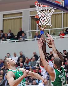 Евролига по баскетболу 2016-17. Матч между командами УНИКС (Россия, Казань) – "Анадолу Эфес" (Турция, Стамбул). Игроки команды УНИКС Артем Параховский (второй слева) и Кит Лэнгфорд (справа) во время матча.