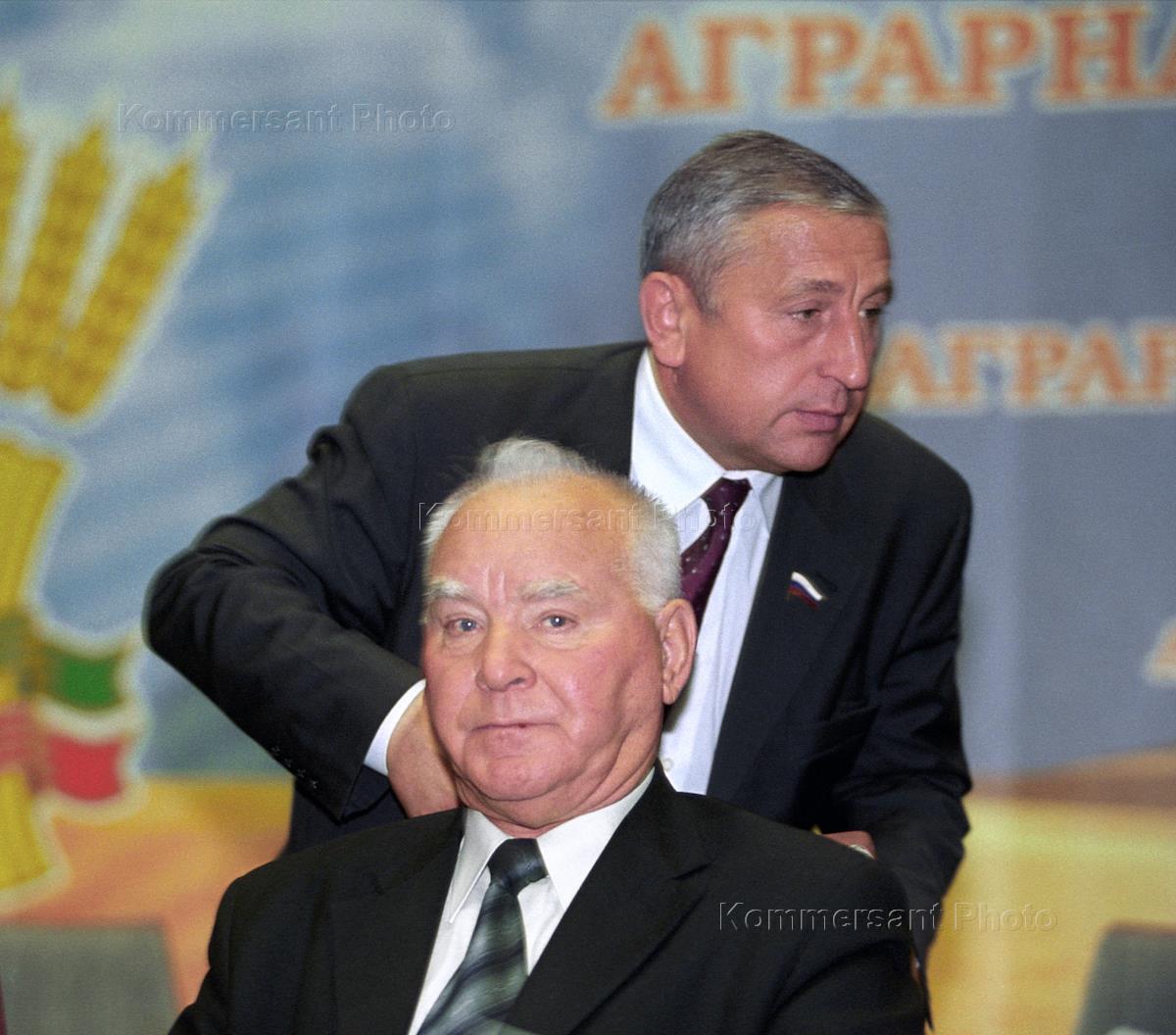 Руководитель Агропромышленной депутатской группы Государственной Думы России Николай Харитонов (слева) и председатель Аграрной партии России (АПР) (справа) Михаил Лапшин на внеочередном съезде АПР. Съезд прошел в здании Мэрии Москвы.