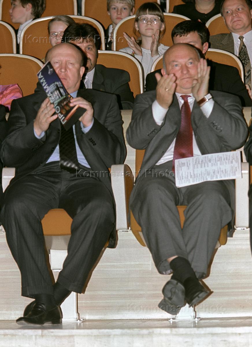 Moscow vice mayor Valery Shantsev (left) and Moscow mayor Yury Luzhkov (right) attend the charitable evening devoted to the Moscow anniversary celebrations. The event was held in the Moscow International Music House.