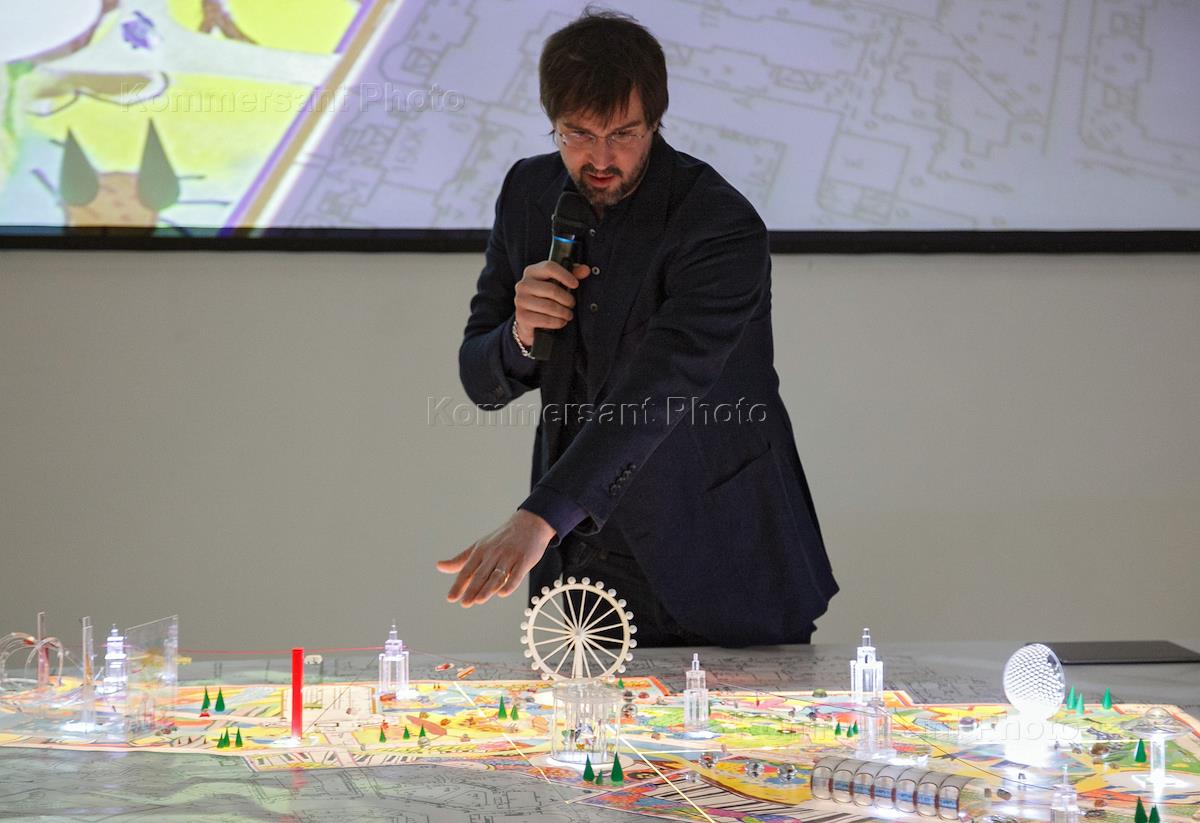 Презентация проекта тематического Всесезонного парка аттракционов на территории Южной части ВДНХ. Автор концепции нового тематического парка аттракционов на ВДНХ, продюсер Андрей Болтенко во время презентации.