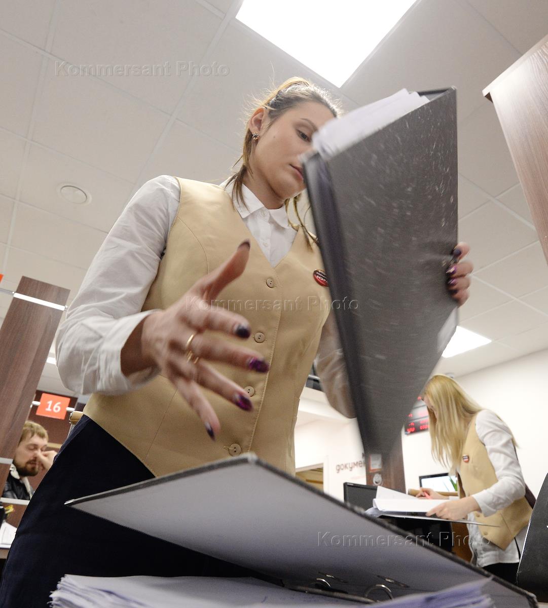 Центр предоставления государственных услуг "Мои документы" района "Тверской". Сотрудник Центра во время работы с документами.