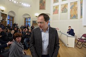 Презентация и обсуждение концепции развития Центрального музея древнерусского искусства имени Андрея Рублева, который в 2017 году отмечает 70-летие своего основания. Министр культуры России Владимир Мединский (слева) во время презентации.