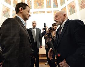 Презентация и обсуждение концепции развития Центрального музея древнерусского искусства имени Андрея Рублева, который в 2017 году отмечает 70-летие своего основания. Президент Международного кинофестиваля славянских и православных народов "Золотой Витязь", актер, режиссер Николай Бурляев (слева) во время презентации.