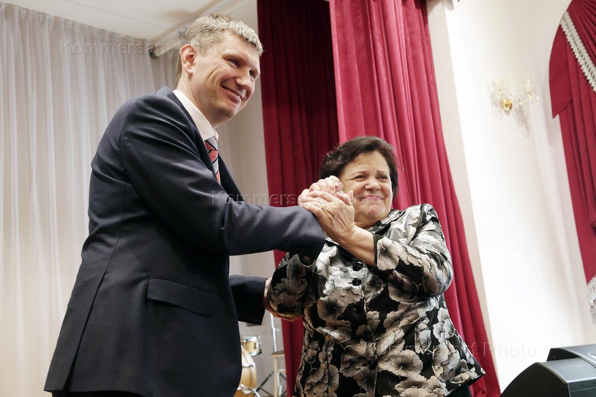 Губернатор Пермского края Максим Решетников (справа) и директор гимназии № 17 Элеонора Падей (слева) в актовом зале гимназии.