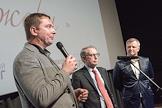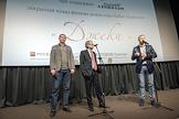 Закрытый показ фильма "Джеки" чилийского режиссера Пабло Ларраина прошел в рамках совместного проекта ИД "Коммерсантъ" и киноконцерна "Ленфильм" "Кино с "Коммерсантом" в зале киноконцерна. Генеральный директор "Киностудии Ленфильм" Эдуард Пичугин (второй слева) перед началом показа.