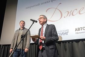 Закрытый показ фильма "Джеки" чилийского режиссера Пабло Ларраина прошел в рамках совместного проекта ИД "Коммерсантъ" и киноконцерна "Ленфильм" "Кино с "Коммерсантом" в зале киноконцерна. Генеральный директор "Киностудии Ленфильм" Эдуард Пичугин (слева) перед началом показа.