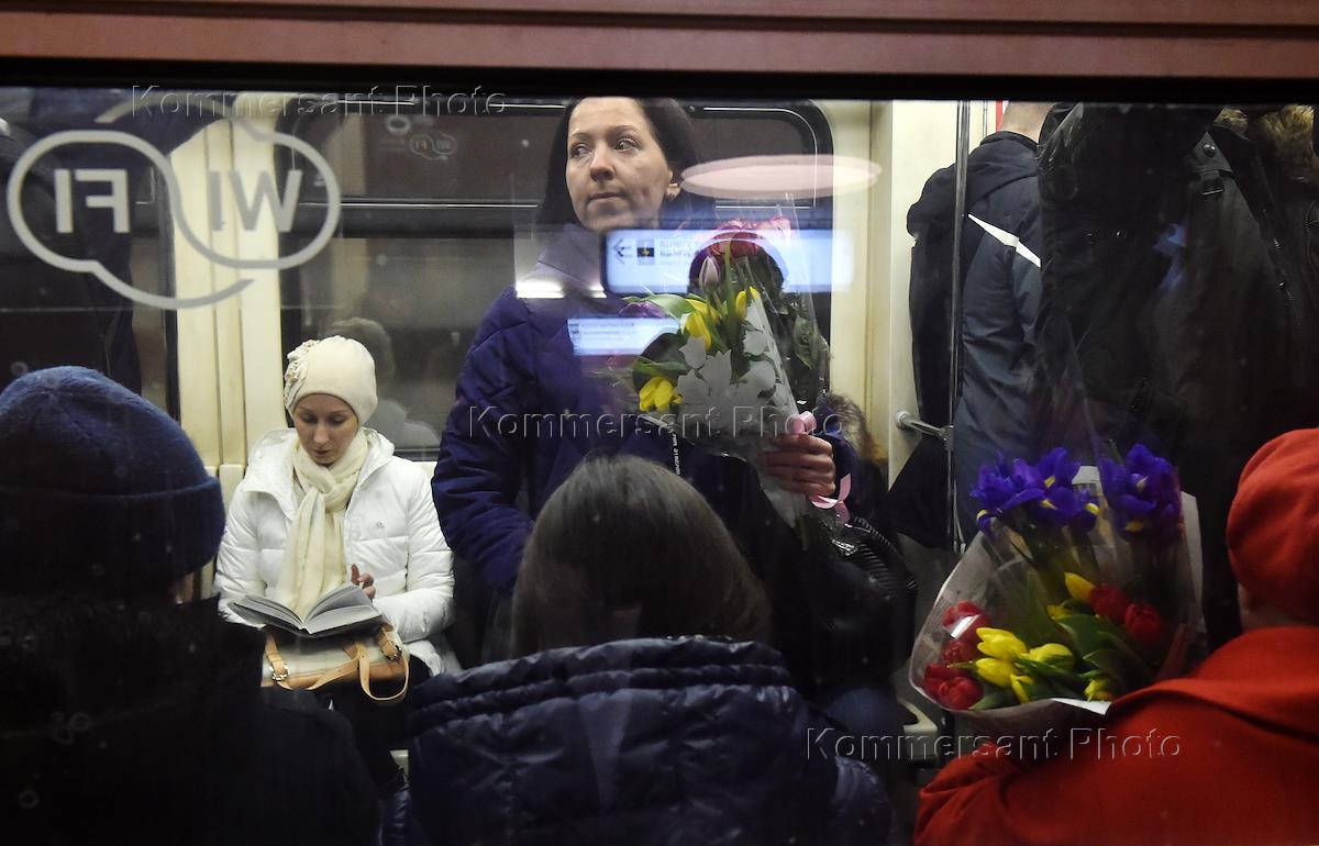 Жанровая фотография. Празднование Международного женского Дня 8 марта. Женщины в вагоне метро с букетами цветов.