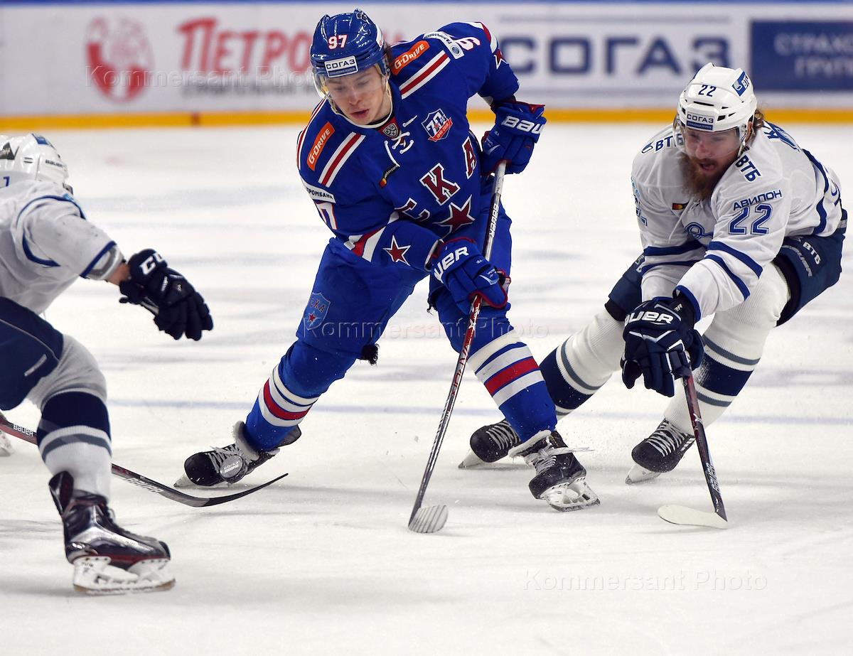 Континентальная хоккейная лига (КХЛ). Кубок Гагарина. 1/4 финала плей-офф. Матч между командами СКА (Санкт-Петербург) и "Динамо" (Москва). Игрок команды СКА Никита Гусев (в центре) и игрок команды "Динамо" Лукаш Кашпар (справа) во время игры.