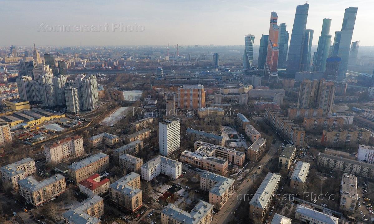 Виды Москвы. Пятиэтажки в Центральном административном округе (ЦАО) вблизи делового центра "Москва-Сити".