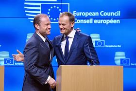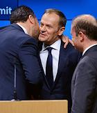 Председатель Европейского совета Дональд Туск (справа) перед выступлением на социальном форуме "День Женщин".