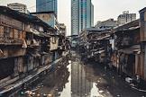 Виды Манилы. Хижины бедняков вдоль городского канала на фоне небоскребов.