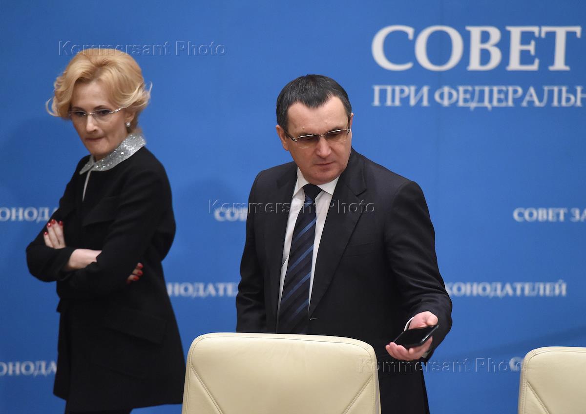 Заседание Президиума Совета законодателей России при Федеральном Собрании России в здании Государственной думе России. Министр труда и социальной защиты России Максим Топилин (слева) и заместитель председателя Государственной думы России Ирина Яровая (в центре) во время заседания.
