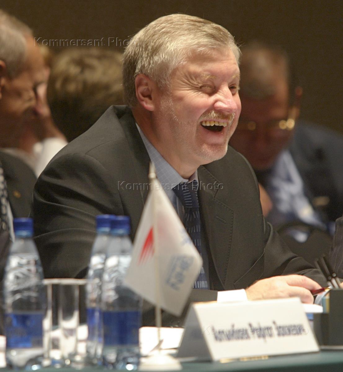 Лидер Российской партии жизни (РПЖ), председатель Совета Федерации России Сергей Миронов (справа) во время съезда РПЖ, который состоялся в Московском международном доме музыки.