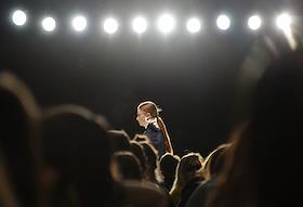 Неделя моды Mercedes-Benz Fashion Week Russia, сезон осень-зима 2017-2018. День второй. Показ коллекции дизайнера Беллы Потемкиной (Bella Potemkina) в Центральном выставочном зале "Манеж". Зрители во время показа.