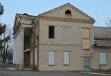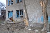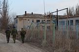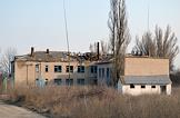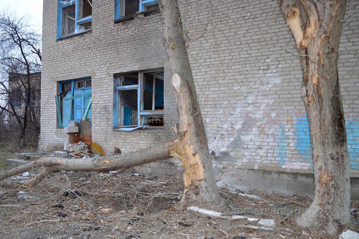 Виды поселка Коминтерново, разделенного между Вооруженными силами Украины (ВСУ) и ополчением ДНР. Территория обстреливаемая ВСУ. Здание школы.