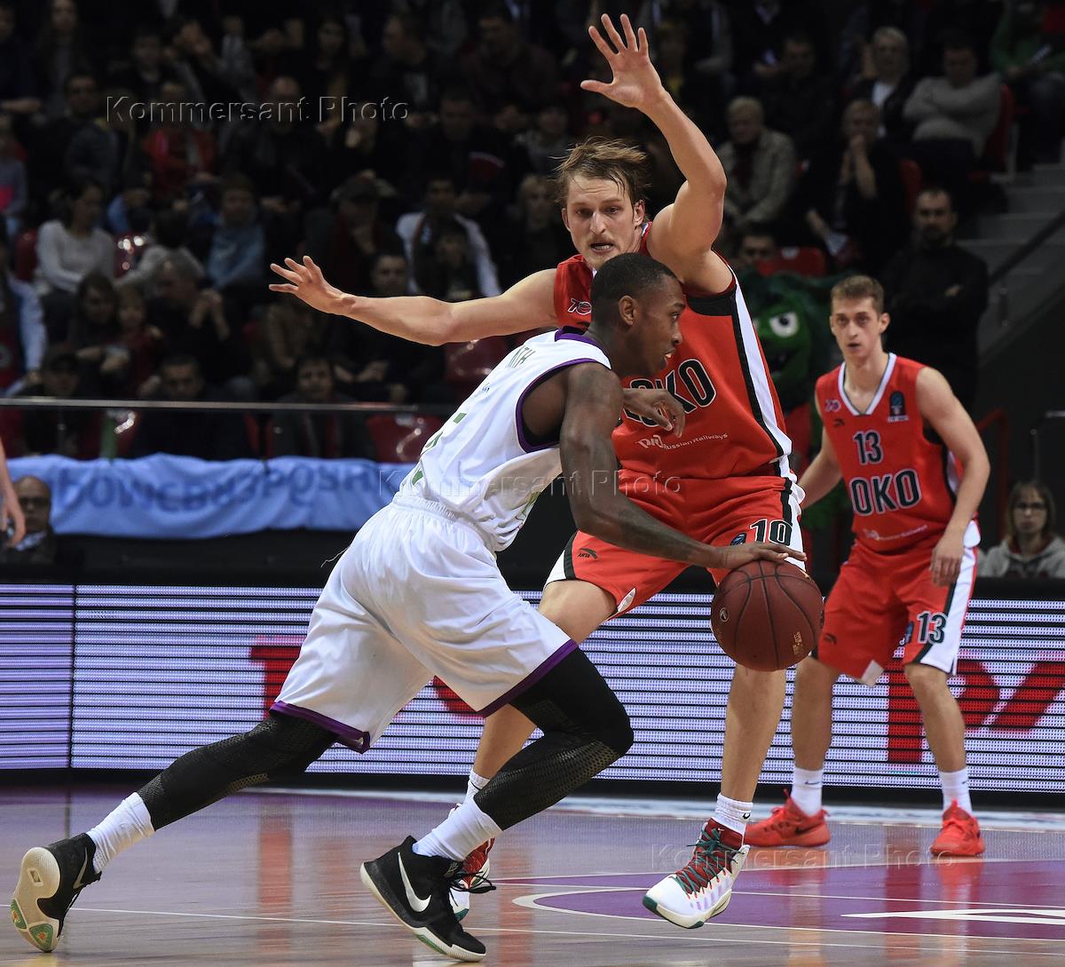 Кубок Европы по баскетболу. 1/2 финала. Матч между командами "Локомотив-Кубань" (Россия, Краснодар) - "Уникаха" (Малага, Испания). Игрок команды "Локомотив-Кубань" Ян Вуюкас (справа) во время матча.