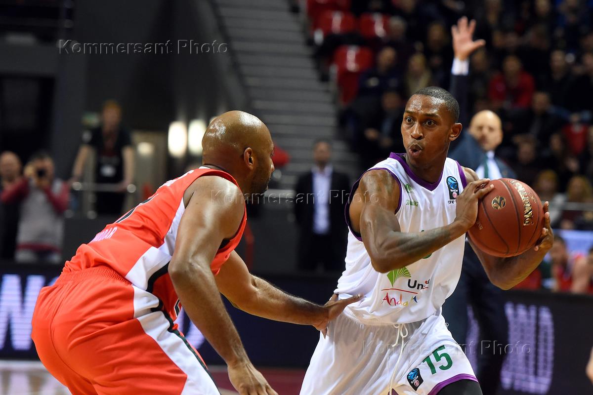 Кубок Европы по баскетболу. 1/2 финала. Матч между командами "Локомотив-Кубань" (Россия, Краснодар) - "Уникаха" (Малага, Испания). Игрок команды "Локомотив-Кубань" Марди Коллинс (слева) во время матча.