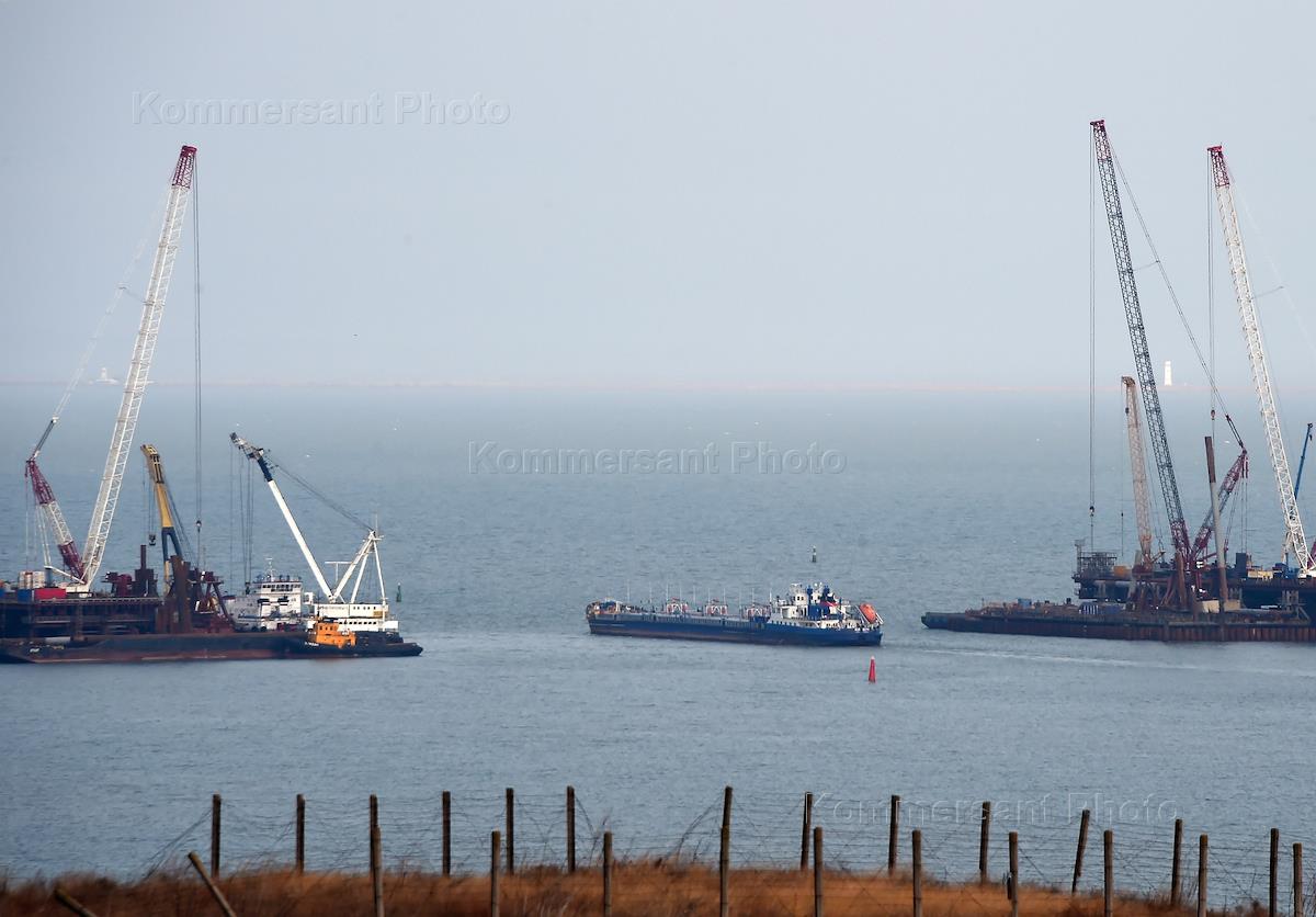 Строительство моста в Керченском проливе, который свяжет Крым с материковой Россией. Вид на строящийся транспортный переход, который пройдет между Керченским и Таманским полуостровами через остров Тузла и Тузлинскую косу.