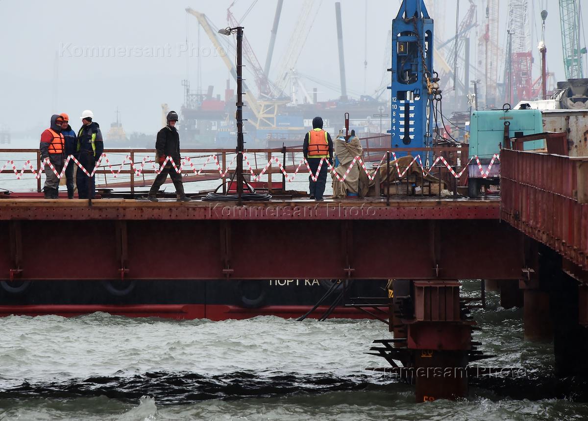 Строительство Крымского моста в Керченском проливе, который свяжет Крым с материковой Россией.