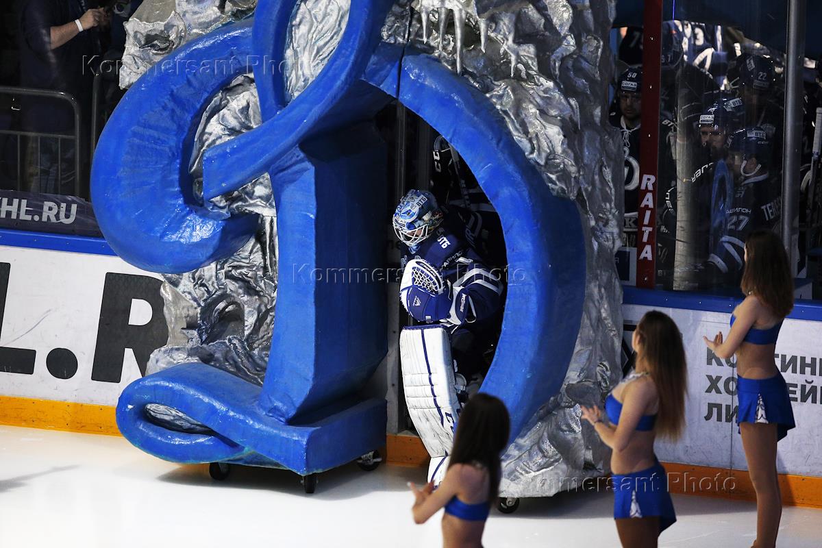Хоккей. Кубок Гагарина. Динамо(Москва)- СКА (Санкт-Петербург). 4 матч серии. Вратарь команды "Динамо" Александр Еременко (в центре) во время выхода на площадку перед началом матча.
