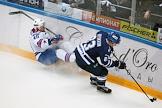 Хоккей. Кубок Гагарина. Динамо (Москва)- СКА (Санкт-Петербург). 4 матч серии. Игрок команды "Динамо" Микко Коскинен (слева) и игрок команды СКА Александр Дергачев (справа) во время матча.