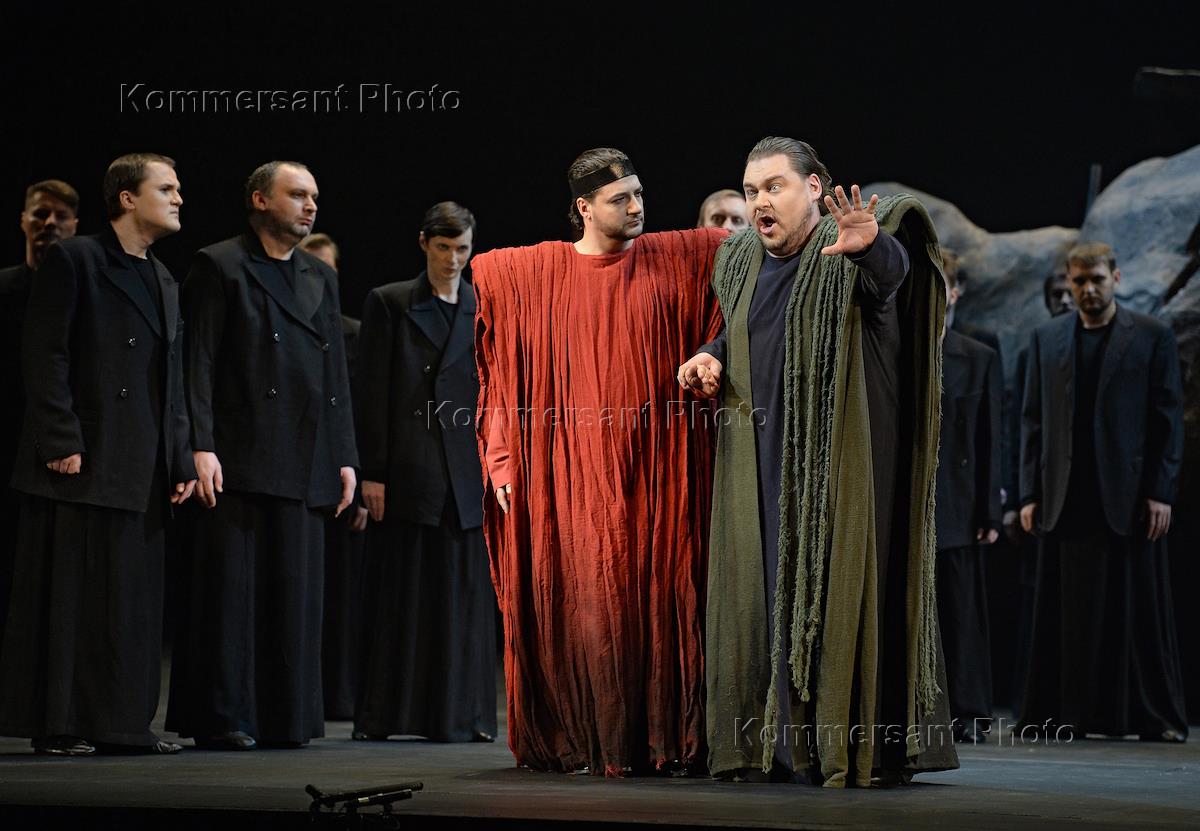 Пресс-показ опер "Эдип-царь" / "Замок герцога Синяя борода" в постановке режиссера Римаса Туминаса на сцене Московского академического музыкального театра имени К.С.Станиславского и В.И.Немировчиа-Данченко. Оперные певцы Евгений Либерман (в цетре) и Максим Осокин (справа) в опере композитора Игоря Стравинского "Эдип-царь".