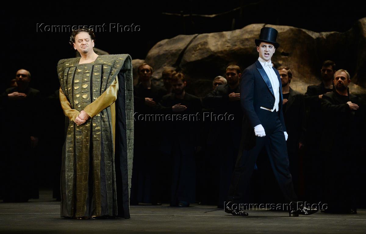 Пресс-показ опер "Эдип-царь" / "Замок герцога Синяя борода" в постановке режиссера Римаса Туминаса на сцене Московского академического музыкального театра имени К.С.Станиславского и В.И.Немировчиа-Данченко. Оперные певцы Евгений Либерман (в цетре) и Максим Осокин (справа) в опере композитора Игоря Стравинского "Эдип-царь".