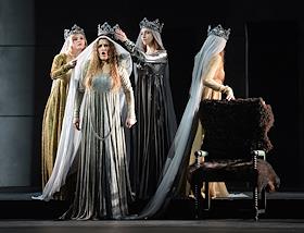 Пресс-показ опер "Эдип-царь" / "Замок герцога Синяя борода" в постановке режиссера Римаса Туминаса на сцене Московского академического музыкального театра имени К.С.Станиславского и В.И.Немировчиа-Данченко. Оперная певица Наталья Зимина (вторая слева) в опере композитора Белы Бартока "Замок герцога Синяя борода".