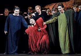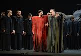 Пресс-показ опер "Эдип-царь" / "Замок герцога Синяя борода" в постановке режиссера Римаса Туминаса на сцене Московского академического музыкального театра имени К.С.Станиславского и В.И.Немировчиа-Данченко. Оперные певцы Евгений Либерман (в цетре) и Максим Осокин (справа) в опере композитора Игоря Стравинского "Эдип-царь".