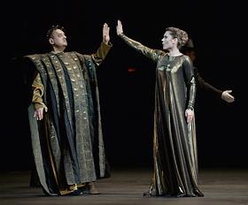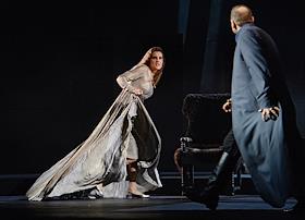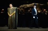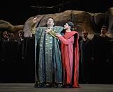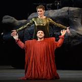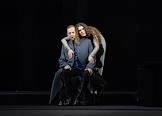 Пресс-показ опер "Эдип-царь" / "Замок герцога Синяя борода" в постановке режиссера Римаса Туминаса на сцене Московского академического музыкального театра имени К.С.Станиславского и В.И.Немировчиа-Данченко. Оперные певцы Роман Улыбин (слева) и Наталья Зимина (справа) в опере композитора Игоря Стравинского "Эдип-царь".